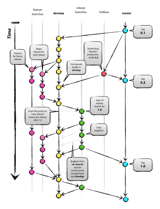 가장 중심이 되는 브랜치는 master와 develop 브랜치이며, merge된 feature, release, hotfix 브랜치는 삭제하도록 합니다.